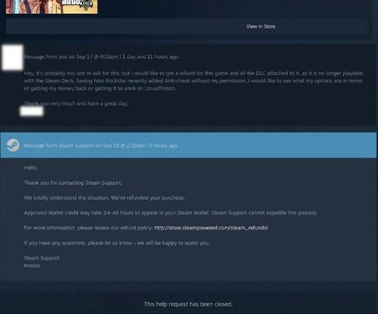 对此,已经有Linux系统的玩家在Steam发起针对游戏的退款,而尽管他已经玩了很长时间,但Steam客服了解情况后依然通过了他的退款申请。在回信中Steam客服表示:“我们完全理解这种情况。我们已经退还了您的购物款。”