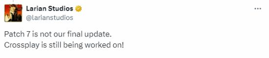 在回应PC Gamer的报道时,Larian官方表示:“7号补丁并不是我们的最终更新。跨平台游戏仍在开发中!”