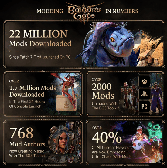 九游娱乐九游娱乐日前,《博德之门3》官方放出了一张数据图。图片显示,自7号补丁在PC平台发布后,其Mod下载量已达到2200万次,7号补丁在主机平台发布的24小时内,主机Mod下载量达到了170万。除此之外,使用《博德之门3》工具包上传的Mod超过2000款,768名Mod制作者使用该工具包制作了Mod。