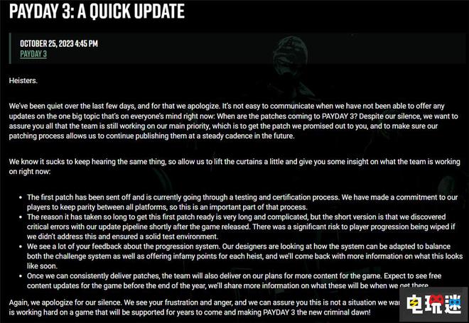 《收获日3》在发售后,就开始了一段“折磨之旅”,无论是匹配不了的玩家还是对游戏修复焦头烂额的Starbreeze。游戏刚上线就遇到大量的问题,Starbreeze Studios的首席执行官Tobias Sjögren曾经向玩家道歉并且承诺尽快修复问题。在最初连忙缝缝补补修复匹配问题之后,官方又在一个月的沉寂与接连跳票。如今终于宣布首个大型补丁做完了,官方也对补丁延迟再次道歉。