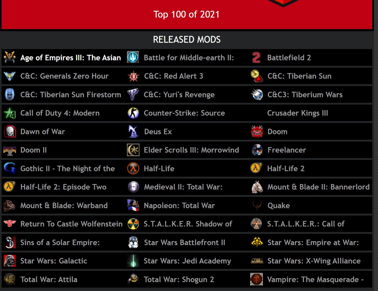 知名MOD网站MOD DB公开了2021年最佳游戏MOD,产生于该站点用户投票的100大MOD。
