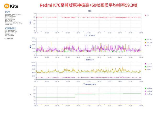 由于配置十分强悍,标准画质下,Redmi K70至尊版的帧率和温度表现出色,在我们意料之中。不过想必很多小伙伴也十分好奇,更高的超分+超帧画质下,Redmi K70至尊版表现如何?