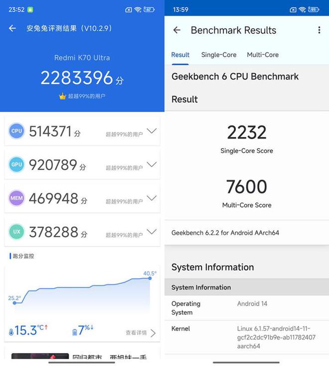 先来看看跑分,Redmi K70至尊版安兔兔评测常温跑分超228万分。GeekBench6测试中,Redmi K70至尊版单核跑分为2232分,多核跑分7600分,表现十分出色。