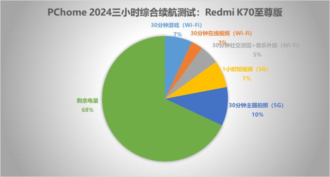 在PChome三小时模型续航测试中,Redmi K70至尊版耗电量32%,剩余电量68%,排在2024年已测机型排行榜的第8位。日常使用和游戏都比较省电,只是在拍照上较为费电。总体来看,在5500mAh的电量下,这个续航能力是很令人满意的。