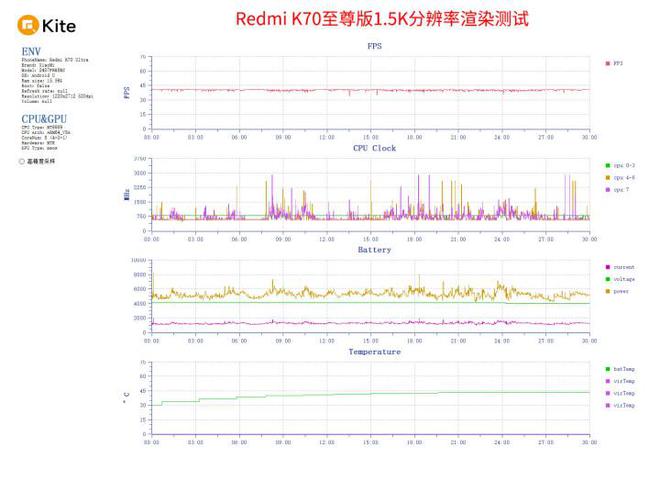 Redmi K70至尊版的游戏全程功耗为4.37W,在PChome 今年测试数据中,是少有的,可以同时符合满帧率且省电的产品。可以这么说,目前的手机中,比它省电的都跑不满,能跑满的它更为省电。此外,Redmi K70至尊版的发热量也不高,正面温度42.6℃,背面温度41.7℃。