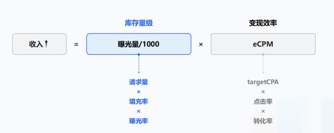 首先,从广告变现收入=曝光量/1000 X eCPM的公式来看,提升广告曝光量和eCPM,才是提升收入的关键。