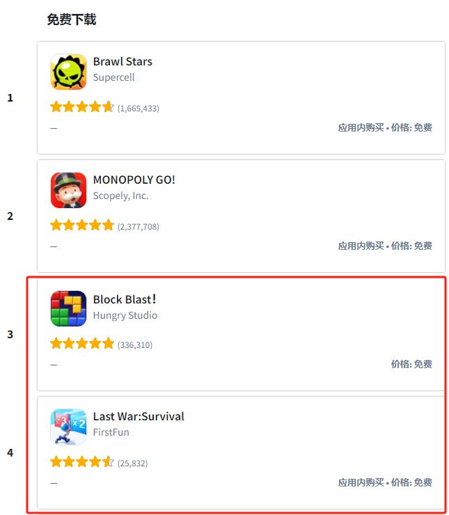 实际上,广告变现热潮不仅存在于国内游戏市场,在全球游戏市场竞争都已趋于白热化的现在,借广告变现谋求生意增长,已基本成为了国内外游戏开发者的共识。比如登上美国iOS免费游戏榜单前列的《Last War:Survival Game》《Block Blast!》《My Perfect Hotel》等爆款,都采用了广告变现设计。