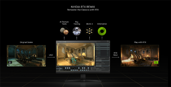 由此,RTX Remix 可将资产和场景转换为被广泛采用的 USD开放式 3D 框架,可以轻松导入到RTX Remix 应用或任何其他 Omniverse 应用或连接器中,并提供可视化工作流程。这种方式可以使得Modder们能够在重置各种不同游戏时延续使用已掌握的技能,而无需学习大量专有工具。