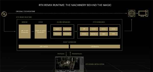 NVIDIA RTX Remix可以轻松重制具有固定功能图形流水线 和 DirectX 9 游戏。RTX Remix可以将游戏中的“捕捉纹理”、“几何图形”、“光照和镜头”等绘图指令发送到GPU,再将这些绘图指令解析为独立资产,将其重新组合成同一场景。九游娱乐