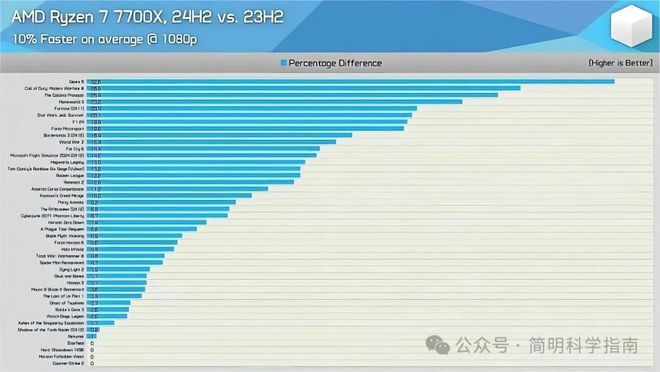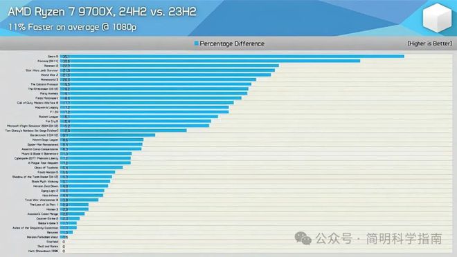 Ryzen 7 7700X在1080p分辨率下,40款游戏平均性能提升达到10%,其中《战争机器5》《使命召唤:现代战争3》《家园3》等游戏的帧数提升了20—30%,这比更换新处理器,从Zen 4升级到Zen 5的性能提升还大,由此可见这Bug影响多大: