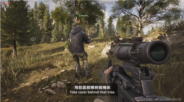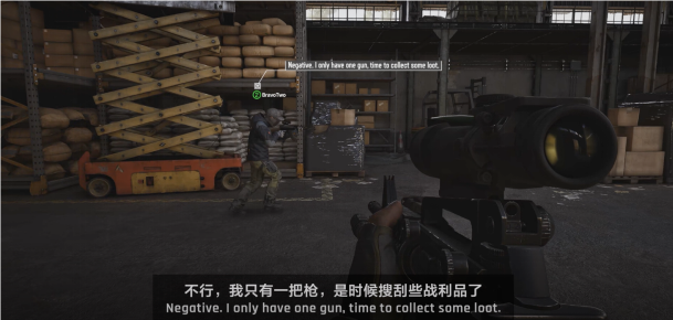 首先是直接分析复杂战术指令语言的能力。在以往的FPS游戏中,玩家只能通过快捷键、指令轮盘向AI队友下达如跟随、防守、撤退等简单命令,而现在,智能队友不仅能够理解复杂如“二号,去前面带路”、“用前面那棵树做掩体”,甚至像“跑到前面用沙袋当掩体,再从沙袋绕到前方汽车后”这样更加复杂的、一系列的指令,使玩家的语言也成为战力的一部分。