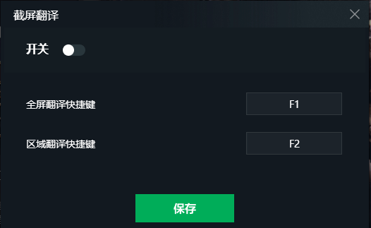 然后就是简单的设置,先把开关打开,然后下面是两个快捷键,一个是全屏的翻译,另一个就是可以选定一块区域翻译,大家可以随意设定一个自己习惯的,并且不影响游戏操作的按键,设置完成点击保存。