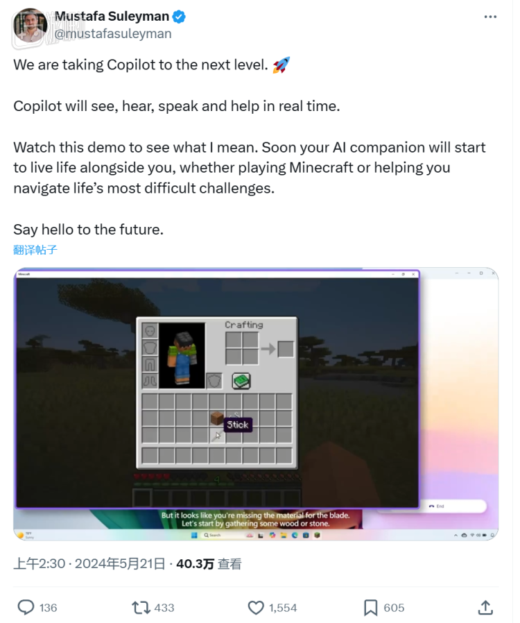 微软 AI 首席执行官 Mustafa Suleyman特意在X上转发这段视频并点评,称他们“正在将 Copilot 提升到一个新的水平”,并表示观看这段游玩《我的世界》的过程大家就知道了——显然对这一阶段性成果相当满意。