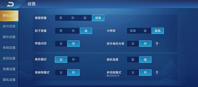 首先就是一些比较基础的设置,建议大家将游戏的画面调到高帧率,虽然这会增加手机的耗电量,但是却能够提高画面的平稳程度,减少在游戏里面的卡顿。同样多线程模式在游戏中也是必须要开起的,这能够帮助自己提高打团的平稳程度,防止在打团的时候手机一卡,不知不觉中就打输了团战。其他的设置则是一些视觉上的体验,大家可以根据自己的喜爱自己调节。