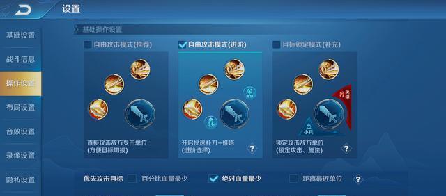 除此之外就是优先攻击目标的设置,百分比血量最少指的是当前英雄所剩生命值百分比,而绝对血量最少指的是剩余血量数值的最小,可能坦克英雄百分比血量很低,但是他们的基础生命值要远远超过射手,所以推荐大家选择的是绝对血量最少,这样可以更为轻松的攻击到脆皮,也能够更有利于刺客英雄去切入后排。第三种攻击模式也是很少使用的,特别是打团的时候是非常不利的。