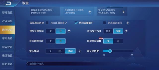 紧接着就是游戏里面的操作设置,大家普遍使用的一种操作模式就是自动攻击模式,能够自己切换攻击小兵和推塔,防止在推塔的时候攻击到敌方英雄,这样的操作设置在游戏中也是比较常见的。但是有些英雄并不适合这样的操作,比如大家都喜欢使用的李白,李白的操作设置最适合的就是第一种。第三种攻击模式难度比较高,非常考验玩家的反应,所以不推荐大家使用。