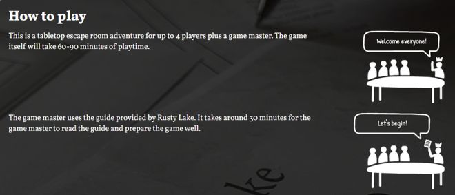 游戏管理员使用 Rusty Lake 提供的指南。游戏管理员大约需要 30 分钟来阅读指南并做好游戏准备。
