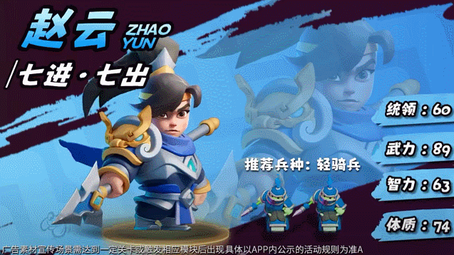 素材Q版的人物角色风格令人印象深刻,但和大部分采用Q版可爱风格的三国题材游戏不一样的是,这则素材里的角色更显憨态,例如诸葛亮不再像其他作品那样飘逸出尘,反而给人一种身宽体胖随和大叔的印象,给人观众一种反差和新鲜感。