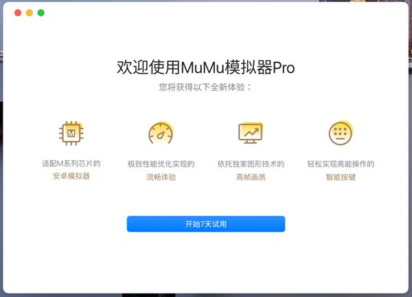 第五步:此时会弹出试用窗口,初次使用MuMu模拟器Pro的Mac设备,可以直接领取到试用资格,获取资格后,就可以开启MuMu模拟器Pro了。