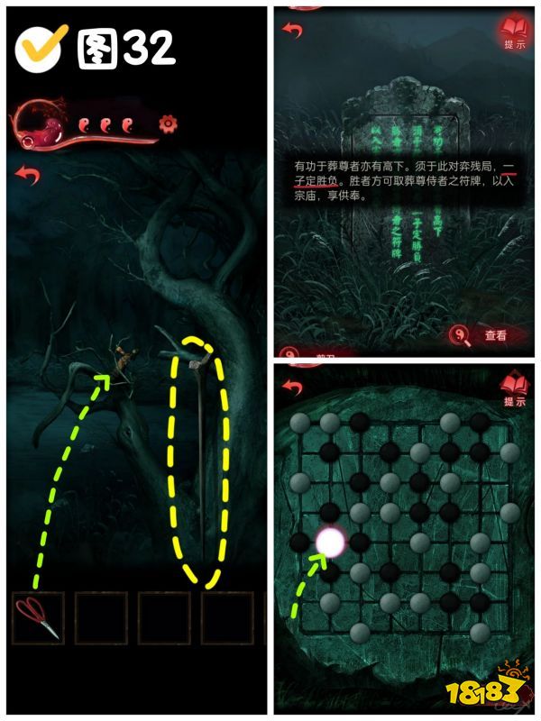 【红王娇彤】村口左转,爬到树上,拿到〔拐杖〕,用剪刀剪下左侧的树枝。下去点击观察石碑,“对弈残局,一子定胜负”,当做五子棋下(耍赖),落子第5行第2列,拿到〔无面雕像〕。(图32)