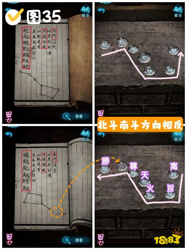4.【蓝申墨卿】打开横梁右侧书柜,阅读《名諱秘字》,根据第一页和第二页的线索,将死阵改为生阵,保阳魂,即北斗改为南斗。