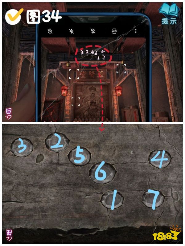 3.【蓝申墨卿】拿出手机观察横梁上北斗七星装饰的闪烁顺序,从左到右编号1-7.闪烁顺序为“5-2-1-7-3-4-6”(如果没记住,可以收起手机重新照横梁),重复此顺序点击下方供桌上的宝石。(图34)
