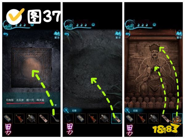 【蓝申墨卿】进入祠堂,将石冠和石笏装到神像浮雕上,机关开启。(图37)