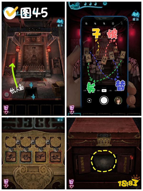 拿出手机照纸人,观察纸人举的牌子,组合同色框内的笔画,“绿矣-蓝替-黄子-红娘”,根据组成的文字解锁祠堂外台阶旁的柜