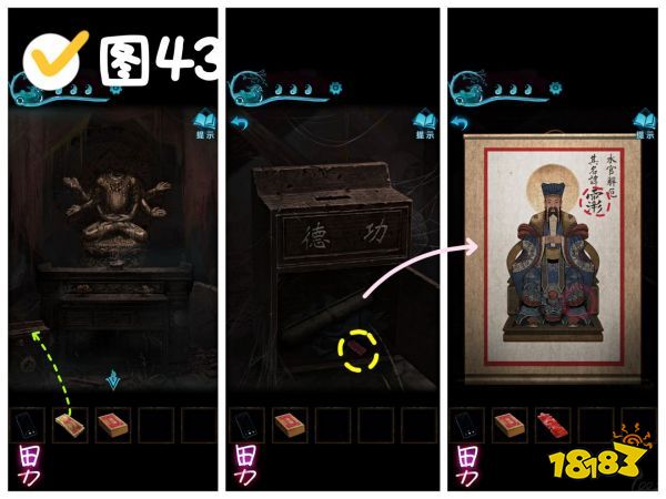 【蓝申墨卿】到达通道尽头,观察地官大帝画像,记住右上角地官名讳。供桌上拿到〔拜神金纸〕,点击返回。(图41)