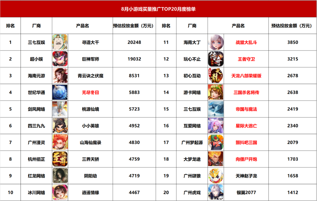 老产品中草花互动的《荒野迷城》投入超过8000万,从上个月的42名跃升至第18位;贪玩游戏的《骷髅传奇》跃升到了第2位,8月投放金额超3.2亦,环比增幅超过700%。