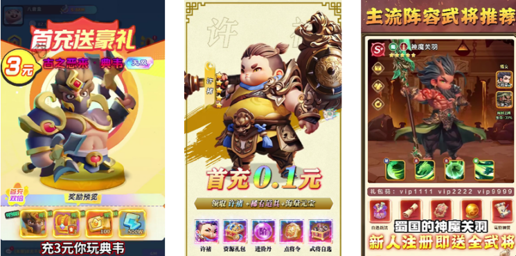 主要集中在卡牌类游戏来体现角色特征,具备直观的视觉冲击力。特点是随着福利道具价值的升级,外部光效也会变得更炫酷,进而强化玩家“赚到了”的心理感受。厂商还可以充分利用自己的亮点作为信息补充,《小兵大作战》和《狙神军师》的文字宣传的是低氪金高回报,小游戏版的《巨神军师》则宣传的是无消费免费赠送的福利。