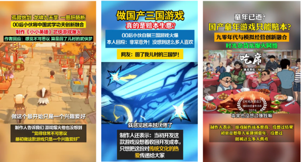 这类素材使用了固定的台词文本来模拟模拟采访制作人的情景,台词文本都是强调制作人不考虑盈利以兴趣爱好为第一动力兴趣爱好制作游戏和对游戏爆火的意外,以玩家的角度为玩家做游戏等内容为模板来宣传情怀和升华主题等。