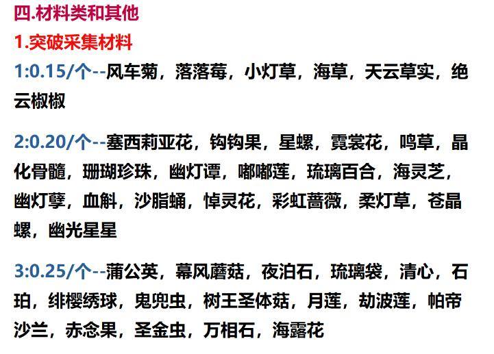 小紫的《原神》代肝价格表主要包括四大部分,一是日常与活动的托管,用户可以按天或者按月下单,其中“委托”日常的价格是2元一天。二是补探索度的价格,比如“枫丹4.0地图”补全是300元,单区100元。第三种是做任务,不同任务的价格不同。最后一种是采集材料,比如游戏中的晶蝶、风车菊、落落莓、小灯草、蘑菇、甜甜花、松果等都是0.15元一个。