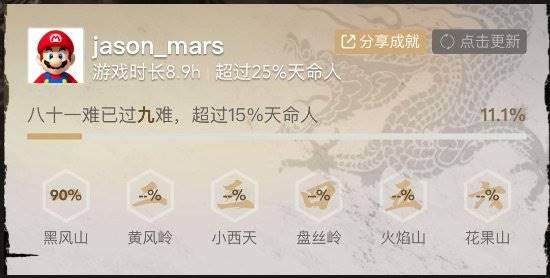 另外,在这里你还可以看到你当前解锁成就的比例,以及超过了全球多少玩家。并且你还可以一键将这些数据分享出去——告知你的亲朋好友,你就是渡过劫难最多的那个天命人!