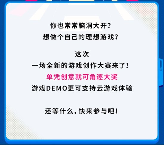 游戏创作大赛,适合每一个有自己想法的创作者。本次大赛设置两个组,如果你是技术大神,能够制作出了游戏试玩demo,你可以参加“试玩体验区”的评比,比赛尊重动手能力强的选手。通过官方成熟的“云试玩”技术,玩家们通过云游戏线上体验Demo,即时为你打分,让你的作品更好地分享给大家。