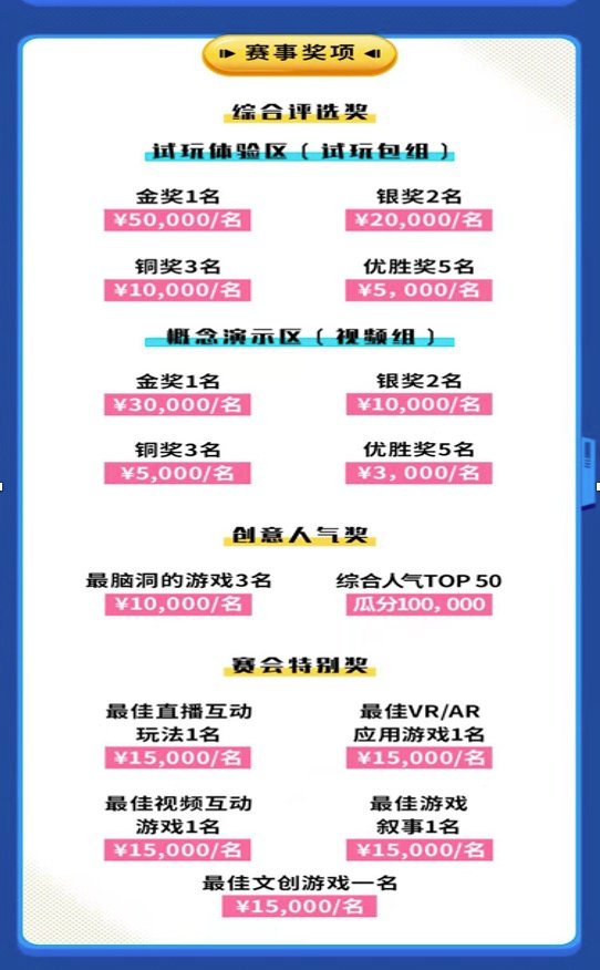 游戏创作大赛不仅有免费的宣发资源,还有多个奖项以及与之对应的奖金。单个奖项最高奖励人民币5万元,“试玩体验区”与“概念演示区”有各自的奖池,也有同台竞技奖九游娱乐项。