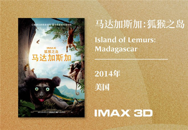 IMAX 3D《马达加斯加狐猴之岛》聚焦马达加斯加岛上的野生狐猴,由著名影星摩根弗里曼担任解说。影片使用IMAX 3D摄影机拍摄,不仅全方位细致呈现狐猴的生活习性和美不胜收的秘境风光,也对人与自然和谐共存的美好愿景展开探讨。借助IMAX身临其境的观影氛围和纤毫毕现的细节表现,观众将如同亲临马达加斯加这一动植物天堂观光探险,与狐猴家族近距离接触,获得赏心悦目的体验。