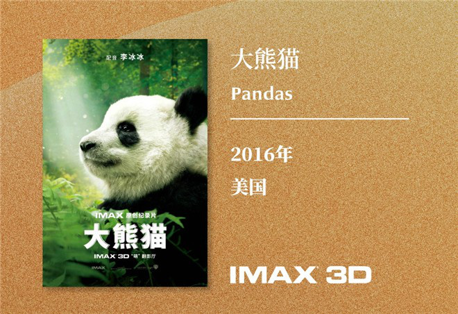 IMAX 3D《大熊猫》全片使用IMAX摄影机拍摄,由李冰冰担任旁白。影片以成都大熊猫繁育研究基地一名叫“倩倩”的大熊猫为主角,讲述在大熊猫野化放归研究中,“倩倩”如何逐步提高野外生存能力,及其环境适应能力的故事。借助IMAX高清高亮的画质和纤毫毕现的细节效果,每一根毛发都清晰可辨的“国宝”将更加萌化人心,在IMAX的沉浸氛围之中深入自然世界的治愈体验亦将难能可贵。
