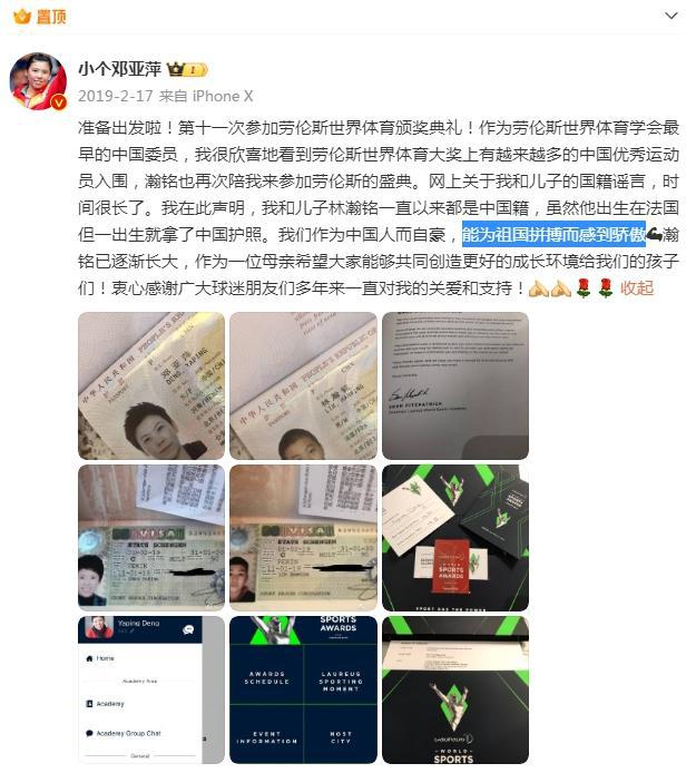 而在邓亚萍置顶的微博上,也澄清了此事,“我和儿子林瀚铭一直以来都是中国籍,虽然他出生在法国但一出生就拿了中国护照。我们作为中国人而自豪,能为祖国拼搏而感到骄傲……”这是邓亚萍早在2019年时发的微博。